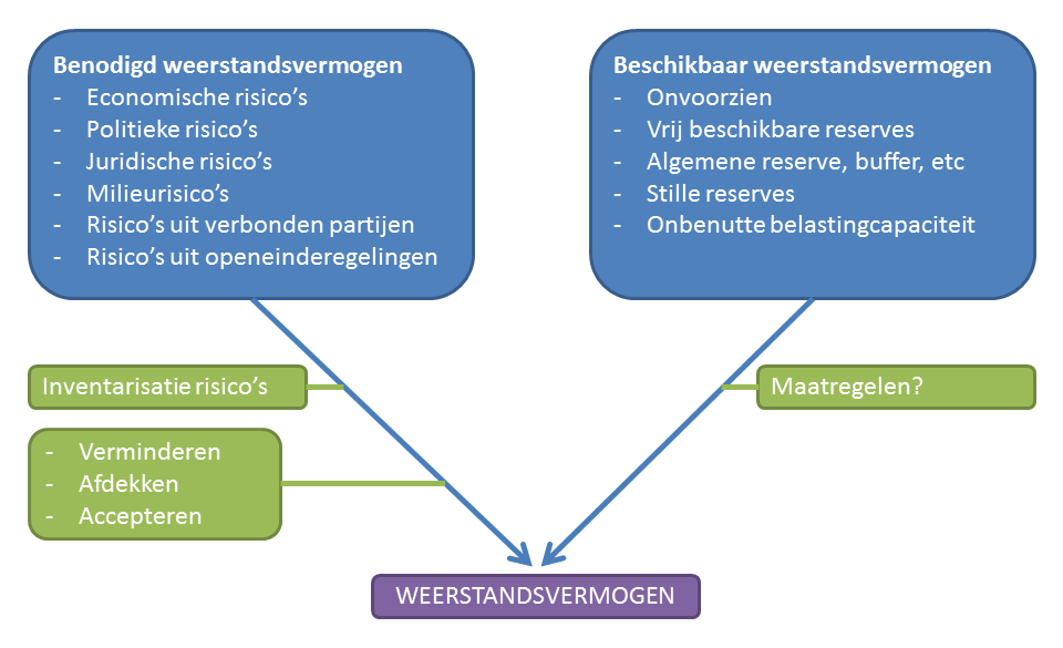 Belangrijk daarbij is dat de wetgever op diverse plaatsen aangeeft dat gemeenten ten aanzien van het nemen van financiële risico’s terughoudend moeten zijn. Dit is dan ook een leidend beginsel voor onder andere het Treasurybeleid, zoals dat in het Treasurystatuut naar voren komt. Bij een gezond weerstandsvermogen is het mogelijk een niet voorziene financiële tegenvaller te betalen door de algemene reserve aan te spreken. Wanneer er onvoldoende weerstandsvermogen is, moeten wellicht activiteiten worden uitgesteld om tegenvallers op te vangen.
